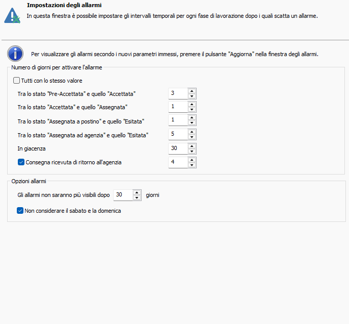 PostOfficeManager permette di impostare i seguenti allarmi: