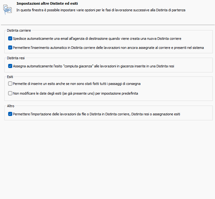 Se attiva questa opzione al momento della creazione di una Distinta resi, per le lavorazioni in essa inserite ed in stato in giacenza, verrà inserito un esito di compiuta giacenza.