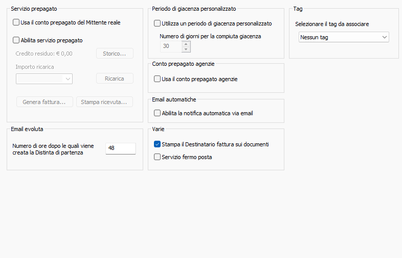 - Usa il conto prepagato del Mittente reale: se selezionato permette di usare il conto prepagato per Mittente reale al posto di quello del cliente.