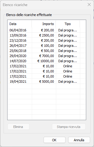 - Storico...: permette di visualizzare l'elenco delle ricariche fatte al cliente. Si aprirà una finestra come quella qui sotto riportata.
