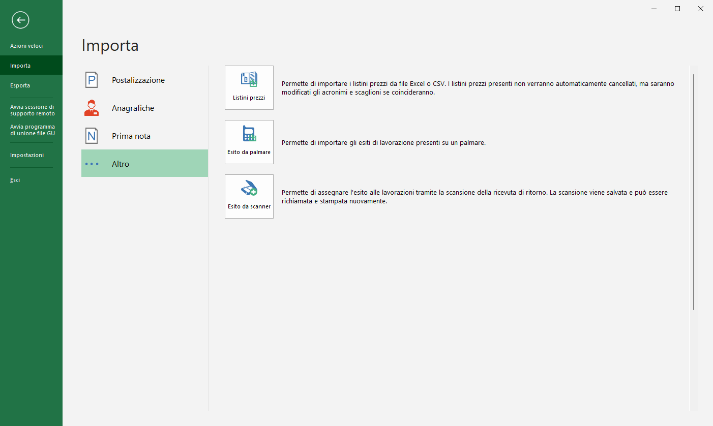 Barra multifunzioneFileImporta Altro Queste funzioni permettono di effettuare importazioni di vario tipo. La più importate è sicuramente Esito da palmare che permette, tramite l'app POScanner 2, di registrare gli esiti con Data e ora certa.