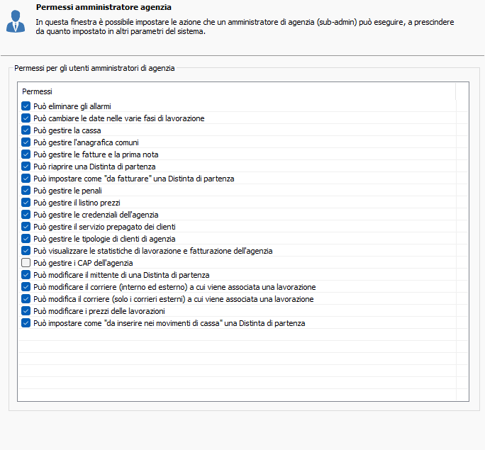 In questa finestra è possibile impostare le azioni che un amministratore di agenzia può eseguire, a prescindere da quanto impostato in altri parametri di sistema.
