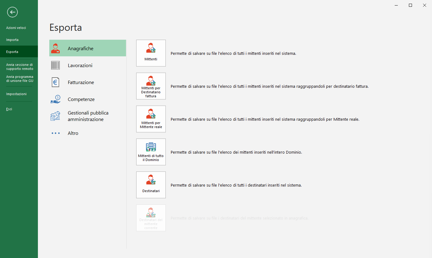 Barra multifunzioneFileEsporta Anagrafiche In questa sezione verrà mostrato come è possibile esportare su file Excel o CSV le anagrafiche dei mittenti e dei destinatari.