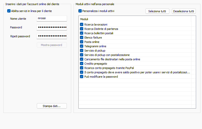 - Stampa dati...: permette di stampare un documento da consegnare al cliente contenente tutti i dati per accedere al servizio online. In questo documento la password viene riportata solo se l'account è stato creato contestualmente.