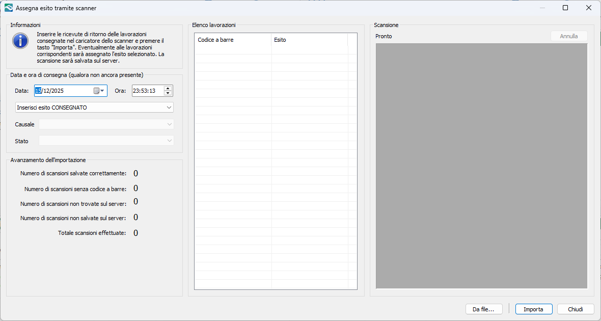 Questa funzione permette di scansionare le ricevute di ritorno delle lavorazioni e salvarle sul server. Il sistema effettua un riconoscimento ottico dei codici a barre presenti nella scansione ed associa automaticamente la scansione alla corretta lavorazione. Contestualmente al salvataggio della scansione è pure possibile inserire un esito di consegna.