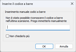 In questa lista vengono riportati tutti i codici a barre riconosciuti nelle varie scansioni e l'esito eventualmente inserito. Se il sistema non dovesse riconoscere o non fosse presente il codice a barre nella scansione, apparirà una finestra come quella sottostante.