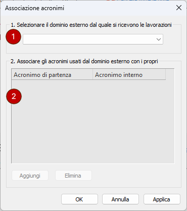 inserire nella prima colonna l'acronimo usato nel dominio di partenza e nella seconda il corrispondente acronimo interno da utilizzare.