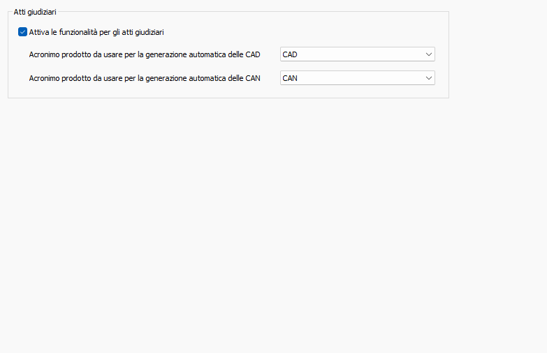 - Attiva le funzionalità per gli atti giudiziari:mettere una spunta per attivare gli atti giudiziari per il cliente. Per le anagrafiche che non hanno attivo quella impostazione non verranno generate automaticamente di Distinte CAD e CAN