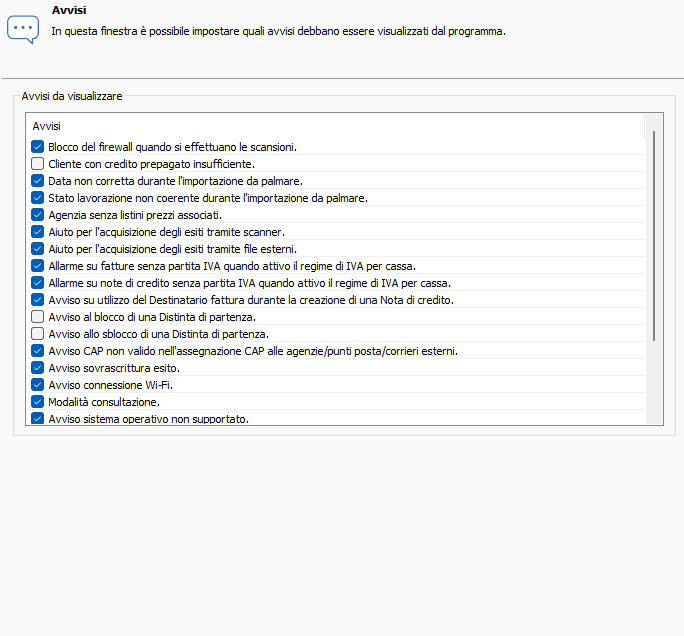 Mettere una spunta sugli avvisi che si desidera visualizzare e toglierlo a quelli che si desidera non vengano più visualizzati. Se in un avviso viene messa la spunta su Non chiederlo più questa impostazione sarà riportata anche nelle impostazioni.