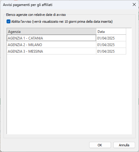 Con questa funzione è possibile far visualizzare un avviso che ricorda alle agenzie di pagare i canoni di affiliazione al Franchising. La funzione è attiva solo per gli Amministratori Dominio.