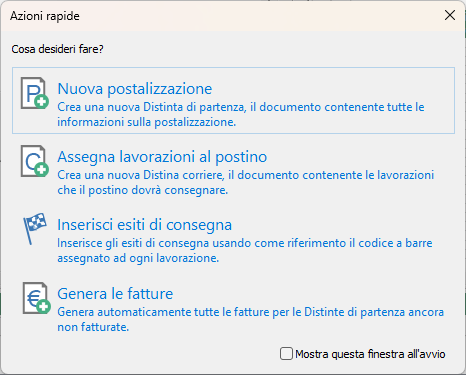 L'opzione Mostra questa finestra all'avvio permette di far apparire la finestra quando si avvia PostOfficeManager.