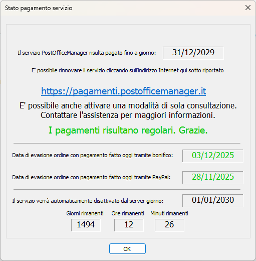 Da questa funzione è possibile richiamare una finestra che mostra la data di scadenza del servizio e riporta il link dal quale procedere al rinnovo dello stesso per altri mesi.