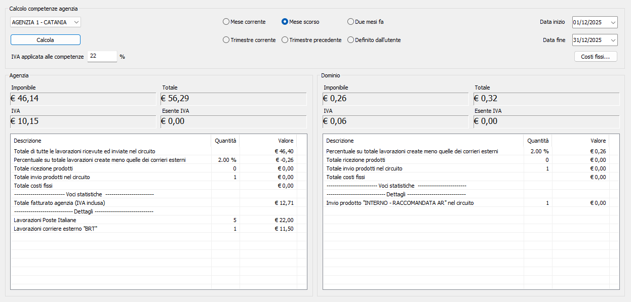 - Calcola: premendo questo pulsante il sistema calcolerà le competenze. I risultanti appariranno nella sezioni Agenzia e Dominio. Le voci che appariranno nelle 2 liste variano in funzione dei parametri inseriti nella sezione Competenze delle impostazioni.