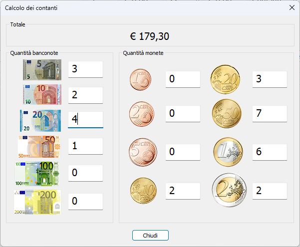 Inserire per ogni taglio di moneta o banconota la quantità in possesso. Nel riquadro Totale verrà automaticamente calcolato l'importo totale dei contanti.