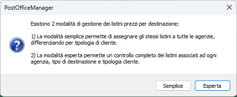 Permette una gestione semplice dei listini, anche se non è possibile attivare alcune caratteristiche avanzate di PostOfficeManager®, quali ad esempio l’utilizzo di listini diversi per agenzie del franchising diverse.