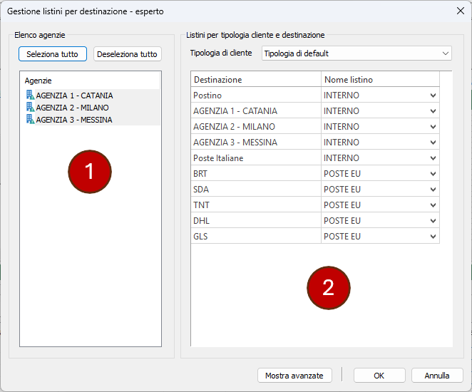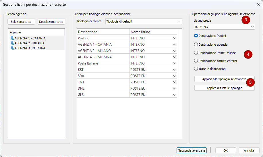 tra postini, agenzie, Poste Italiane, corrieri esterni e Tutte le destinazioni ed applicare