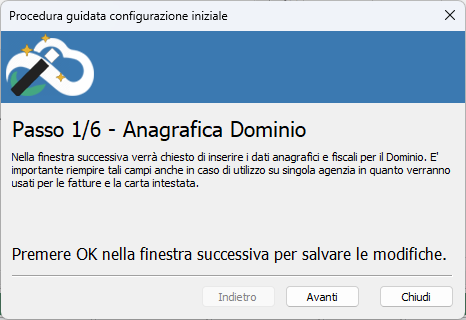 Premere Avanti per procedere. Apparirà la finestra Gestione anagrafica Dominio dove inserire tutti i campi per l'anagrafica Dominio.