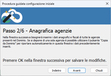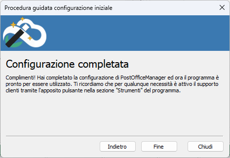 La configurazione guidata iniziale propone una serie di passaggi che solitamente è necessario effettuare appena installato il sistema per la prima volta. Si presenta automaticamente all'apertura del programma, se necessario, oppure può essere richiamata da questo pulsante in un secondo momento.