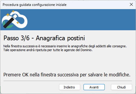 Premere Avanti per procedere. Apparirà la finestra Gestione anagrafica postini dove inserire tutti i campi per le anagrafiche postini.