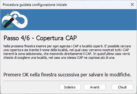 Premere Avanti per procedere. Apparirà la finestra Gestione zone agenzie/corrieri esterni dove inserire le coperture CAP.