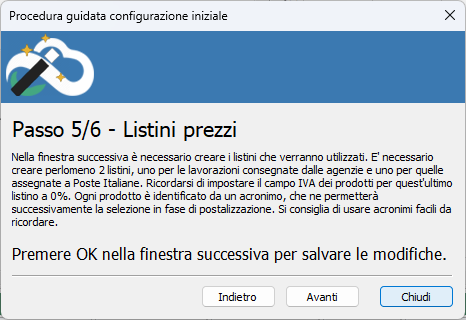 Premere Avanti per procedere. Apparirà la finestra Gestione listini prezzi dove inserire i listini prezzi per le lavorazioni.