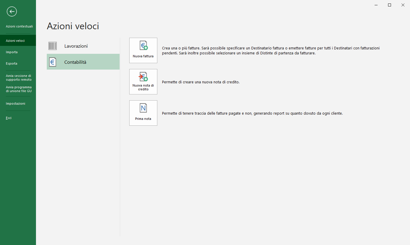 Barra multifunzioneFileAzioni veloci Contabilità In questa sezione sono racchiuse tutte le funzioni di uso comune che riguardano la contabilità.