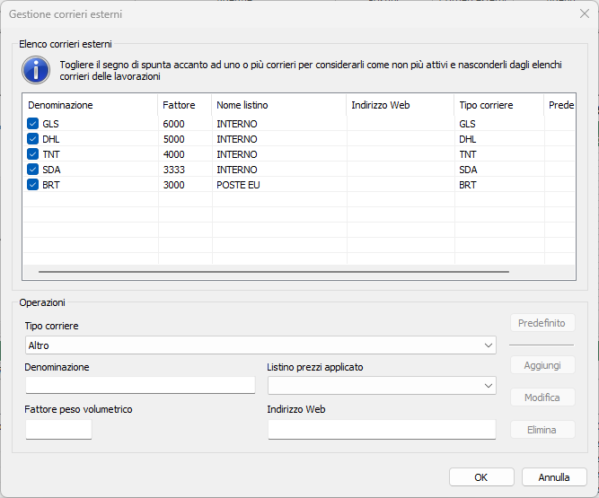 Tralasciamo in questo documento la gestione delle anagrafiche dei corrieri esterni e ci concentriamo sul menu a discesa Listino prezzi applicato.