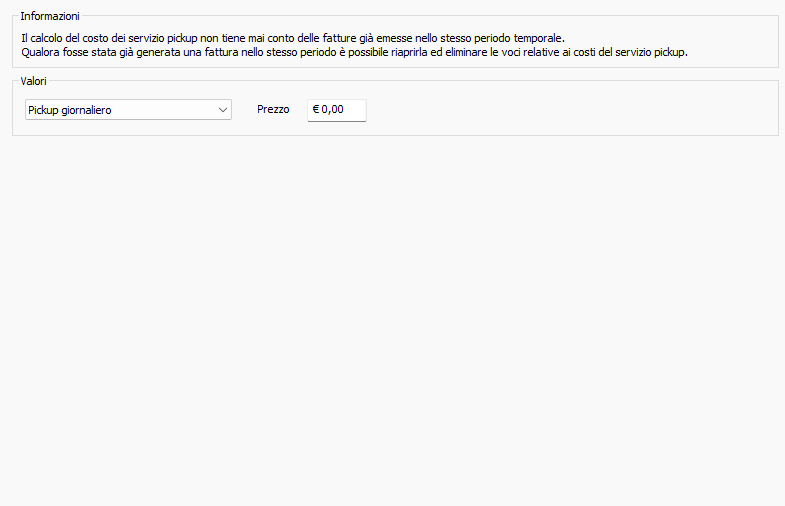 - Giornaliero: viene inserita automaticamente una voci di pickup per ogni giorno in cui è stata creata una Distinta di partenza inserita nella fattura. Se per lo stesso giorno sono presenti più Distinte di partenza viene quindi inserita un'unica voce di costo per quella data.
