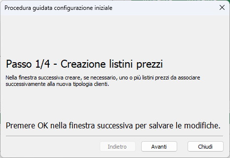 Premere Avanti per procedere. Si aprirà la finestra di Gestione listini prezzi. Fare riferimento a quanto descritto nel relativo capitolo per creare uno o più listini prezzi da utilizzare per la nuova tipologia cliente. Se i listini prezzi fossero già stati creati chiudere la finestra apertasi automaticamente.