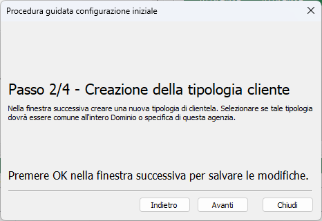 Premere Avanti per procedere. Si aprirà la finestra di Gestione tipologie di clienti. Fare riferimento a quanto descritto nel relativo capitolo per creare nuove tipologie cliente, Se le tipologie cliente fossero già state create chiudere la finestra apertasi automaticamente.