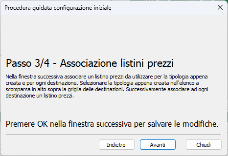 Premere Avanti per procedere. Si aprirà la finestra di Gestione listini prezzi per destinazione. Fare riferimento a quanto descritto nel relativo capitolo per associare le tipologie cliente create nel passo 2 ai listini creati nel passo 1.