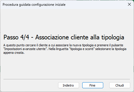 Il processo di configurazione di una tipologia cliente richiede diversi passaggi in PostOfficeManager affinché sia del tutto operativo. Questa funzione fa partire un processo guidato che aiuta l'utente ad effettuare tutti i passaggi nell'ordine corretto.
