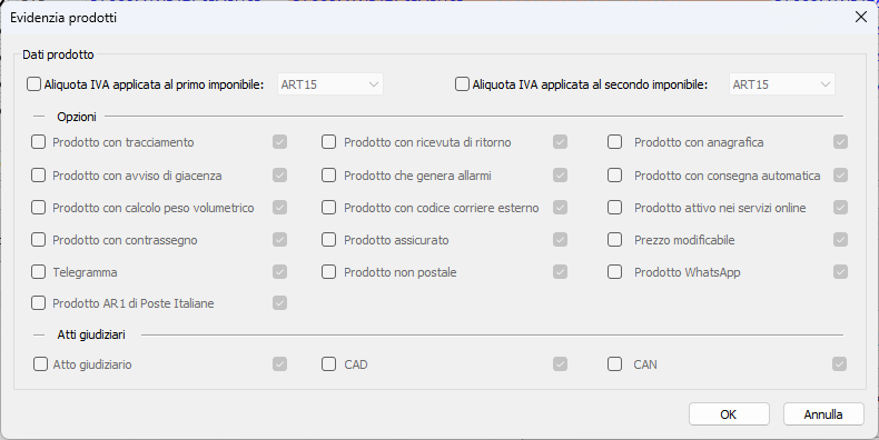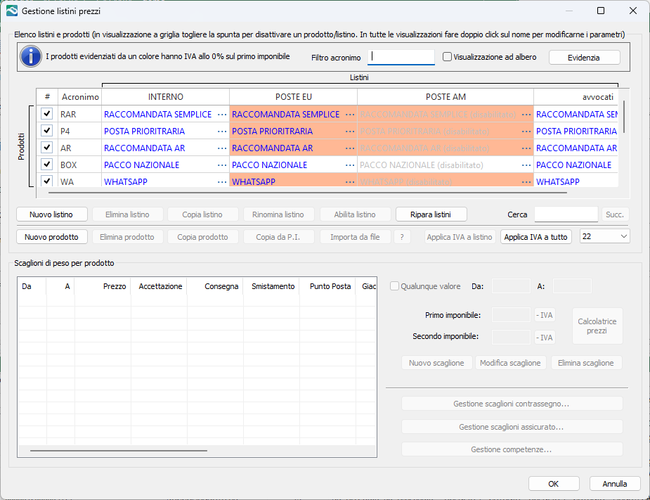 Questa funzione è utile per impostare molto velocemente il listino prezzi per le varianti prodotto di Poste Italiane. Apparirà una finestra dalla quale selezionare un prodotto di Poste Italiane. Una volta premuto OK la variante selezionata verrà sovrascritta con gli scaglioni ed i prezzi presenti attualmente nel listino di Poste Italiane.
