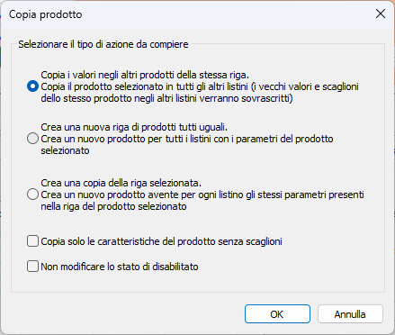 - Copia solo le caratteristiche del prodotto senza scaglioni: selezionando questa opzione le 3 modalità sopra elencate copieranno solo le caratteristiche delle varianti prodotto, altrimenti verranno copiati anche i relativi scaglioni.