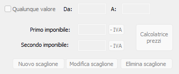 Nei campi Primo imponibile e Secondo imponibile è possibile inserire gli imponibili (esclusa IVA) che compongono il prezzo finale. I pulsanti –IVA accanto permettono di scrivere sul relativo campo dell’imponibile il prezzo ivato e scomputare l’IVA automaticamente.