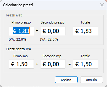 In tale finestra è possibile modificare uno qualunque dei prezzi ivati o meno, nonché del totale ivato o meno, e nelle altre caselle appariranno i prezzi calcolati correttamente. Premendo il pulsante Applica il risultato verrà riportato nei campi Primo imponibile e Secondo imponibile.