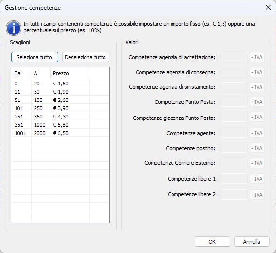 L'inserimento degli scaglioni è agevolato nel caso di tratti di scaglioni “standard”: ad esempio inserendo un intervallo 0-20, una volta premuto INVIO sulla tastiera, oppure il pulsante Nuovo scaglione, il programma riempirà automaticamente i campi Da e A con i valori 21-50, che solitamente sono il prossimo scaglione per i prodotti postali. Nulla vieta logicamente di inserire altri valori, nel qual caso l’inserimento agevolato non interverrà.