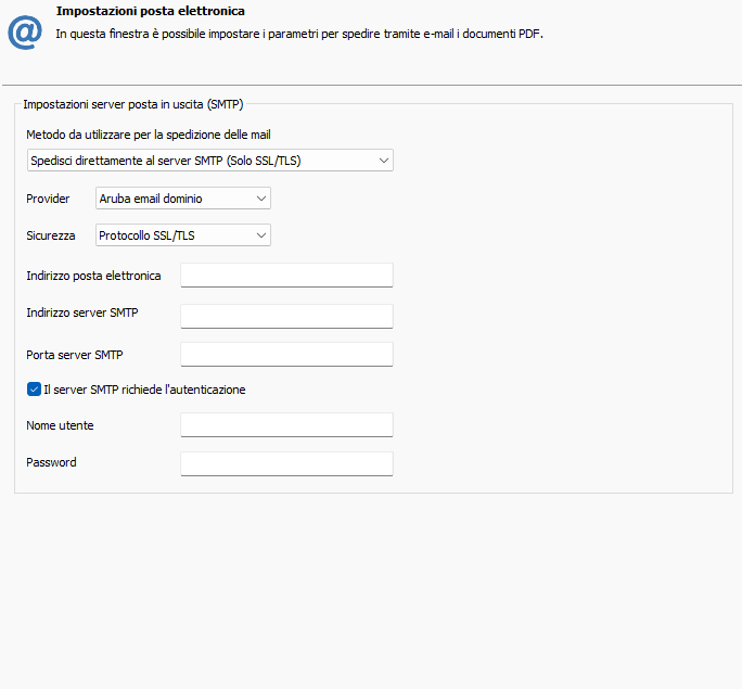 In questa finestra è possibile impostare i parametri per spedire tramite e-mail i documenti in PDF. Si faccia riferimento al proprio provider di posta per inserire i parametri corretti.