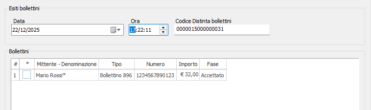 La funzione permette di inserire un esito di pagamento per i bollettini presenti in una Distinta bollettini postali.