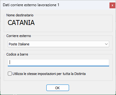 In questa finestra selezionare il corriere esterno da utilizzare ed inserire eventualmente il codice a barre del corriere esterno.