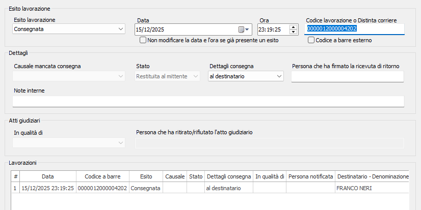 - Dettagli consegna: nel caso di avvenuta consegna in questo campo è possibile indicare a cui è avvenuta la consegna. Questo campo ricopre un ruolo particolarmente importante nel caso di lavorazioni di tipo Atto giudiziario in quando sono presenti delle voci specifiche da utilizzare per la successiva generazione automatica di CAD e CAN.