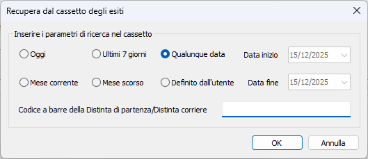 Selezionare l'intervallo temporale entro il quale cercare gli esiti nel cassetto oppure inserire il codice a barre di una Distinta di partenza o Distinta corriere contenente le lavorazioni che hanno esiti nel cassetto.
