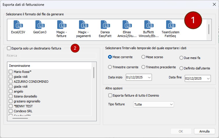 Nella sezione Altre opzioni è possibile indicare di esportare tutte le fatture del Dominio e la tipologia di fatture tra Tutte, Fatture normali e FatturePA.