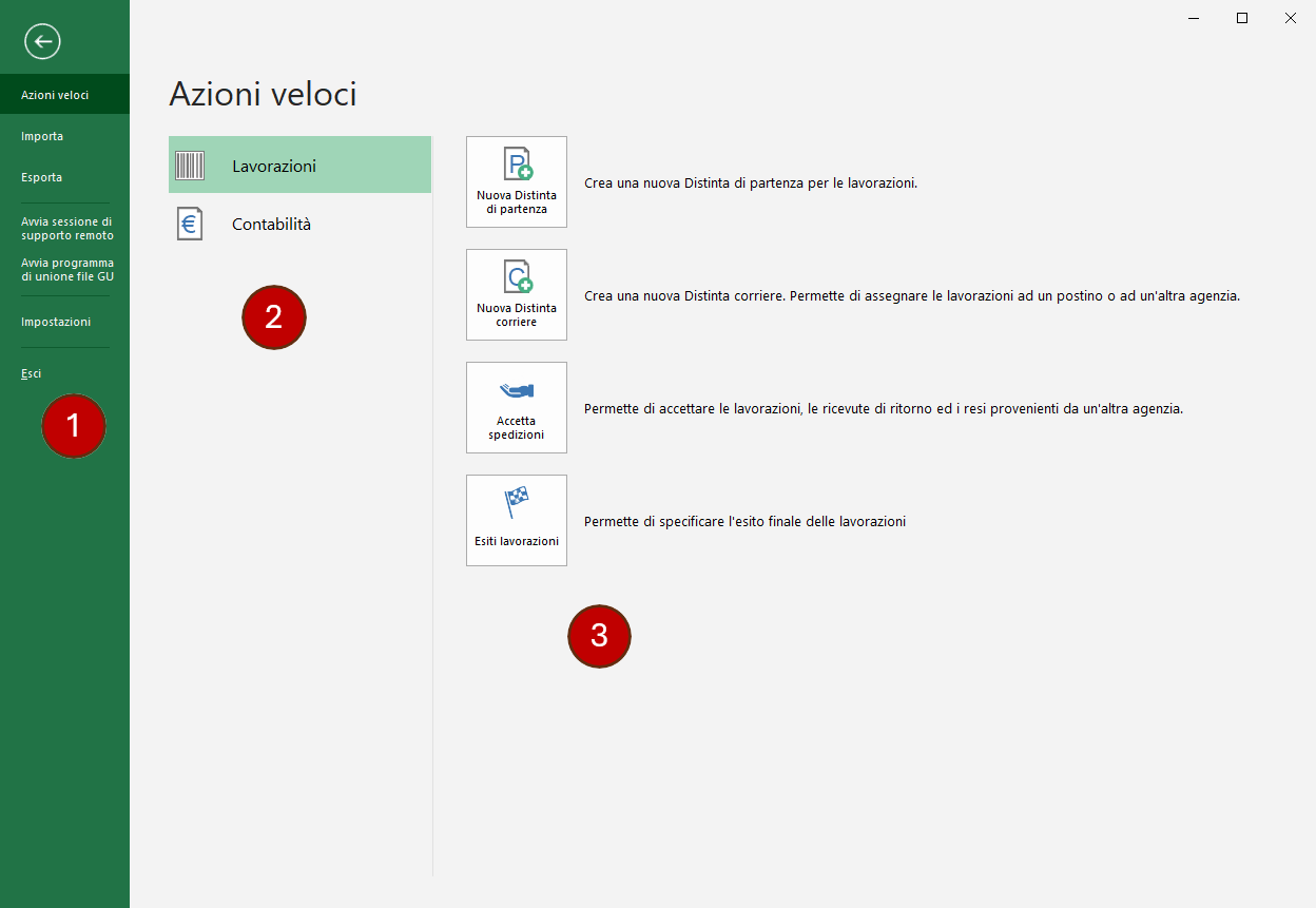 Da questa sezione è possibile accedere sia alle operazioni principali di PostOfficeManager che alle funzioni di importazione ed esportazione dati, supporto remoto ed impostazioni avanzate del gestionale.