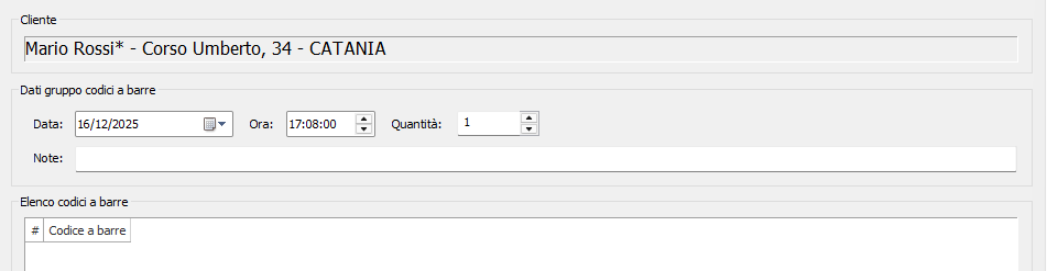 - Data e ora: inserire la data e l'ora della generazione dei codici a barre. Gli utenti di tipo Operatore agenzia non possono modificare questi campi.