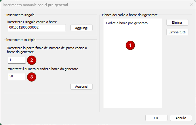 : inserire il numero di codici a barre da rigenerare. - Aggiungi: verranno aggiunti nella lista