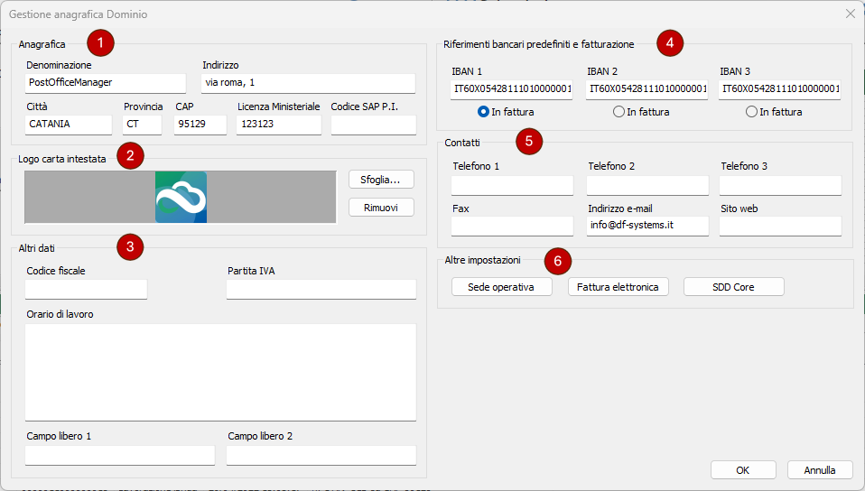 - Denominazione: inserire il nome dell'agenzia che apparirà nella carta intestata.