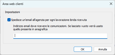- Spedisce un'email all'agenzia per ogni lavorazione ibrida ricevuta: mettendo una spunta su questa opzione ogni volta che viene creata un Distinta di partenza ibrida nell'area clienti web si riceverà una email all'indirizzo inserito in anagrafica agenzia. E' possibile anche specificare un indirizzo email differente compilando l'apposito campo.