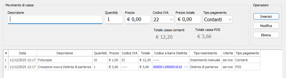 Questa funzione permette di inserire movimenti di cassa nella sessione corrente.