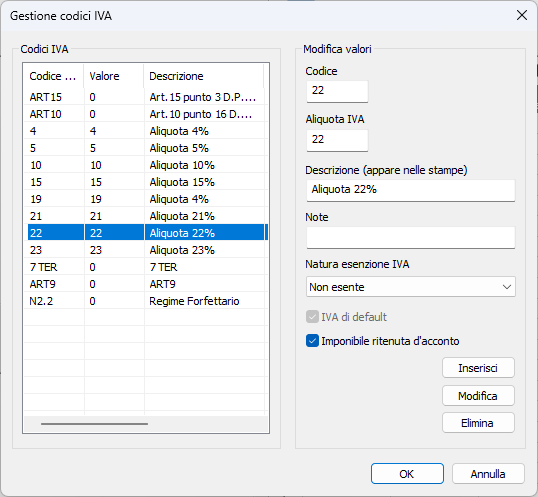 In questa lista sono elencati tutti i codici IVA presenti nel sistema. Selezionandone i relativi dati appaiono nella sezione Modifica valori sulla destra.